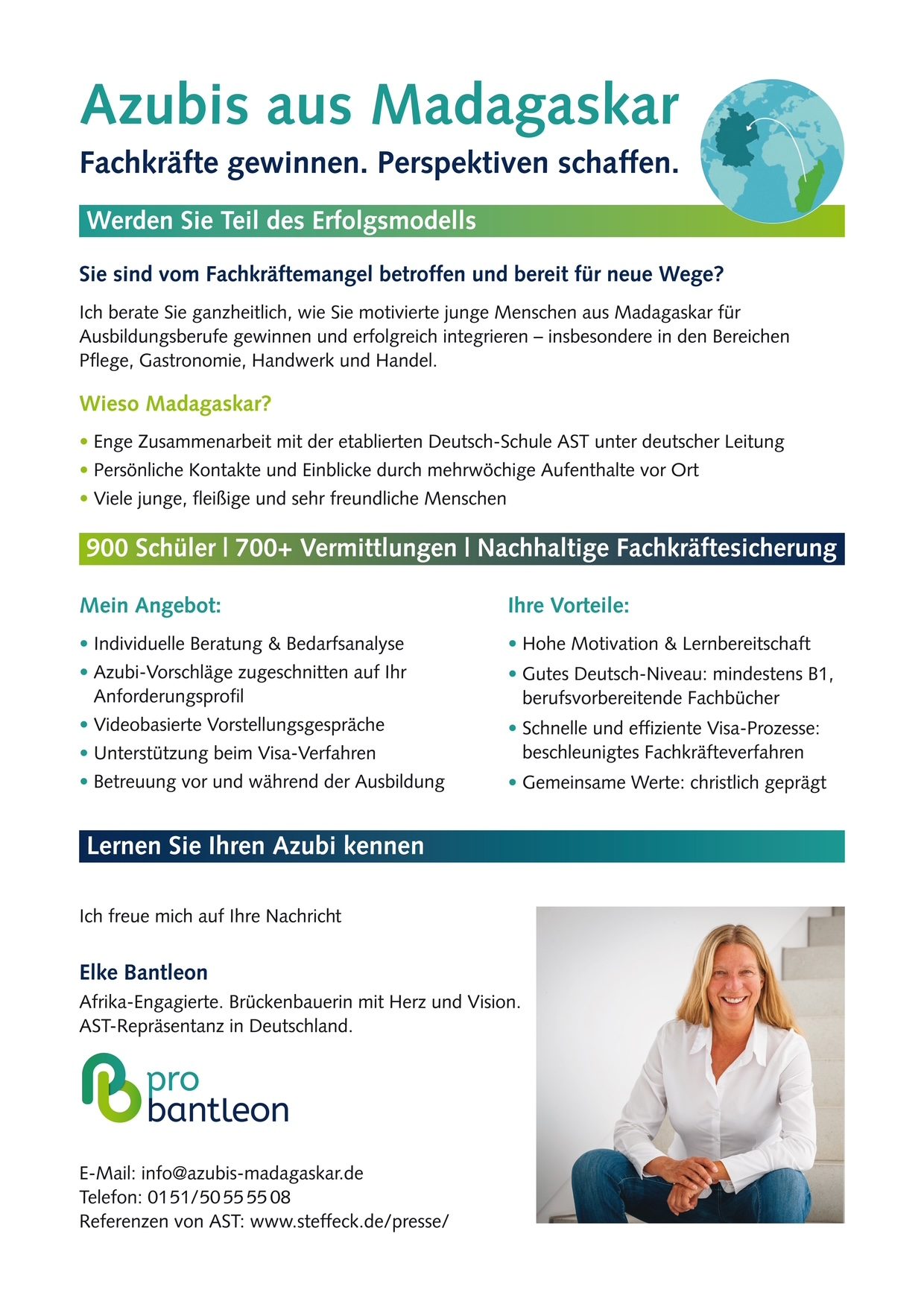 Unsere Azubis haben gute Deutschkenntnisse (mindestens B1), sind hochmotiviert, fleißig, aufgeschlossen und sehr freundlich. An unserer etablierten Deutsch-Schule AST in Madagaskar bereiten wir unsere Schülerinnen und Schüler qualifiziert auf eine Ausbildung in Deutschland vor, mit Fachbüchern passend zum Berufswunsch.